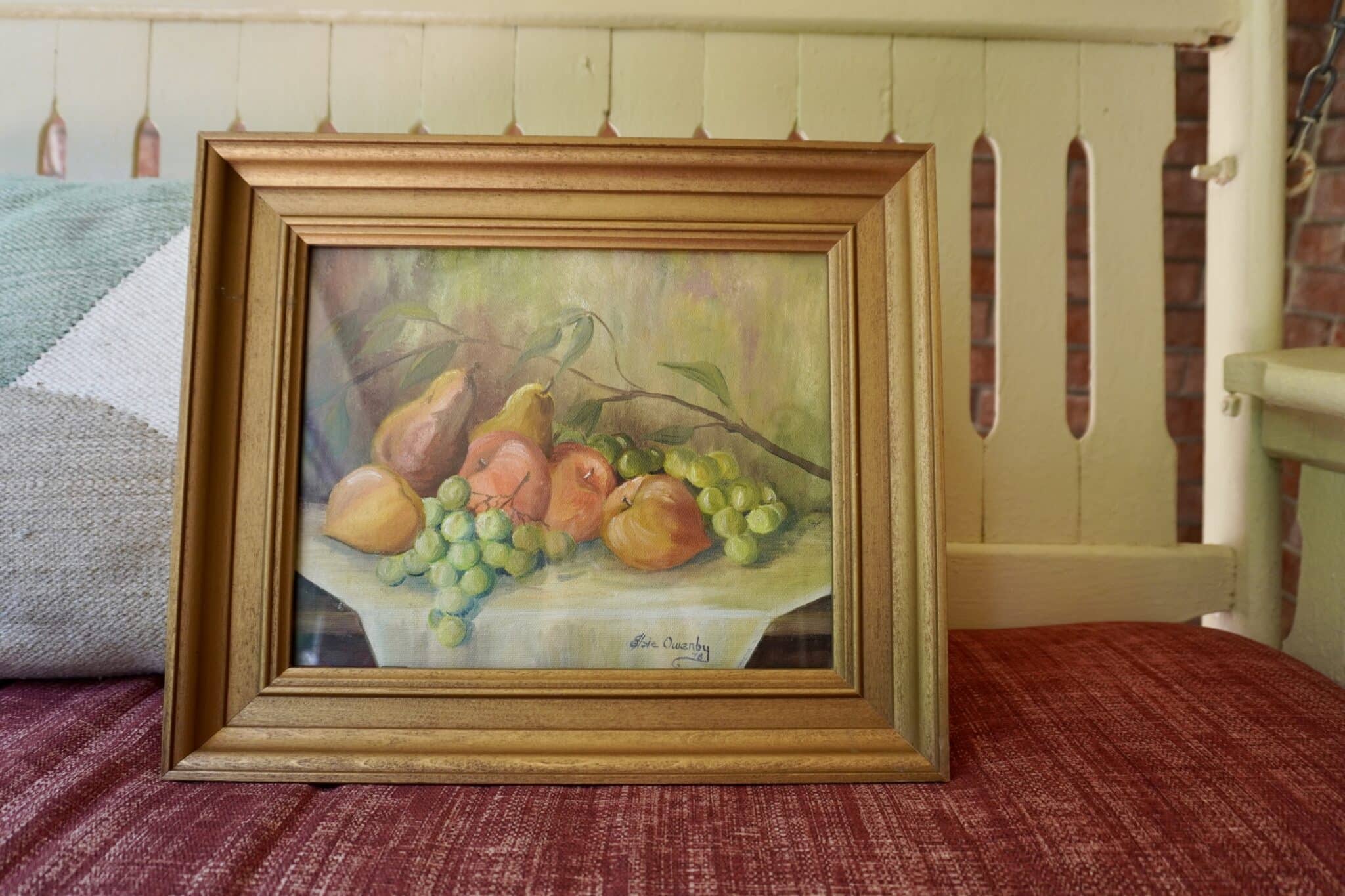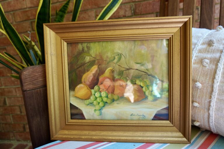 The dining room is where I found her. A simple still life painting of fruit. We have all seen them before. Walking past without notice was easy until my heart pulled me back. I noticed it was signed and framed in wood. Removing it from the wall caused the canvas to release from the masking tape that was frantically holding it in the frame. I wondered if this was the work of the artist or the family’s attempt to create appeal. I chose to believe it was the artist and carried it with care to the pay table. This lonely painting would leave with me.